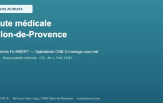 Vous avez subi une faute médicale ou une erreur chirurgicale à Salon-de-Provence, au Centre Hospitalier de Salon-de-Provence, ou chez un praticien libéral dans les communes de Pélissanne, Lançon-de-Provence ou Lambesc ? Me Patrice HUMBERT, spécialiste CNB dommage corporel depuis 20 ans, défend les victimes de fautes médicales et engage la responsabilité médicale des praticiens et
